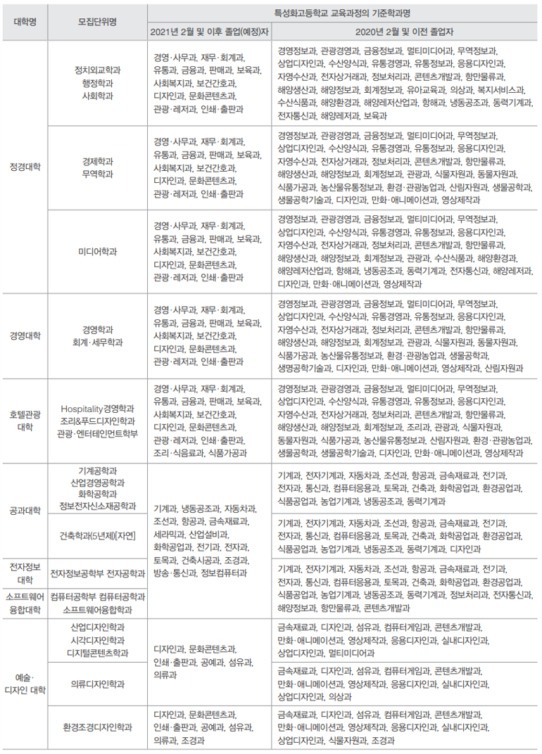 ② 본교가 지정한 지원 가능 모집단위에 해당하는 고교 학과별 기준학과를 이수하지 않았으나, 지원하고자 하는 모집단위와 관련된 전문 교과를 30단위 이상 이수한