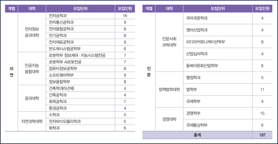 로봇학부 정보제어지능시스템 전공 로봇학부 AI로봇전공 컴퓨터정보공학부 소프트웨어학부 정보융합학부 건축학과 건축공학과 수학과 전자바이오물리학과 화학과 |