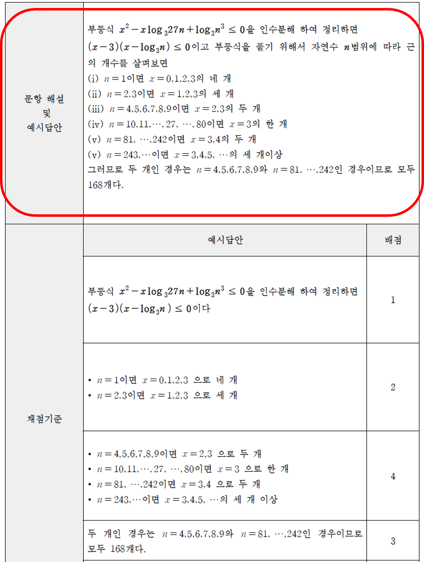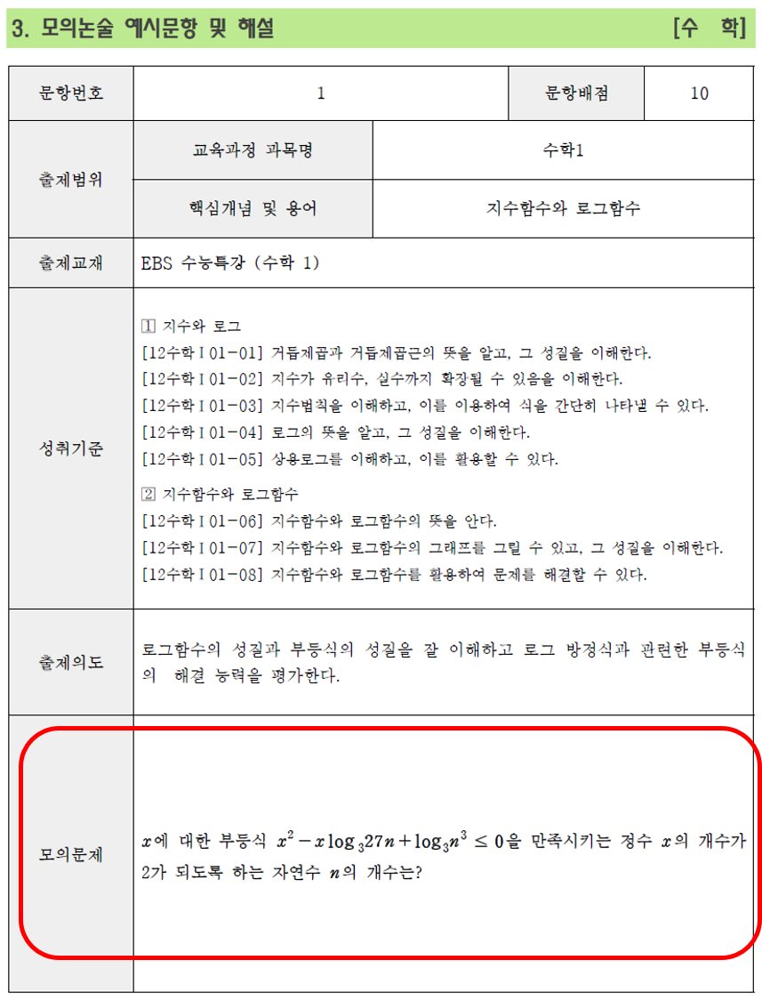 수학 예시문항도 지수와 로그에 대한 기본적인 개념과 성질이 이해하는 학생이라면 충분히 풀 만한 수준의 문제입니다.