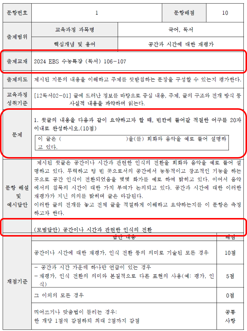 - 문제와 예시답안을 보면 지문에 대해 이해하고 주제를 파악하고 요약할 수 있는지를 측정하고 있습니다.