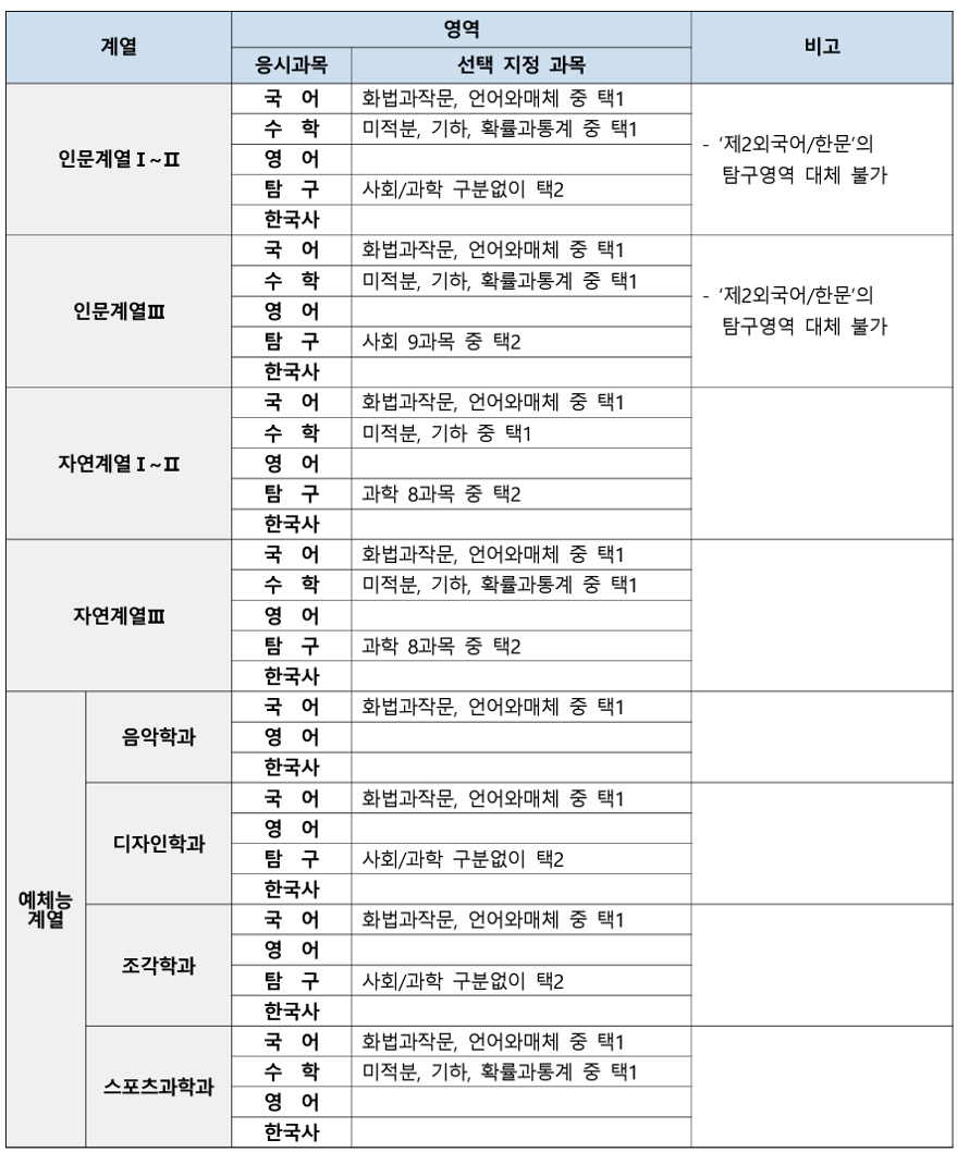 정시모집 계열별 응시과목