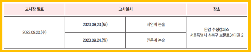 성신여대 논술고사는 2023년 9월23일(토) ~ 9월24일(일)간 실시되며, 고사장 발표는 2023년 9월20일(수) 입니다.