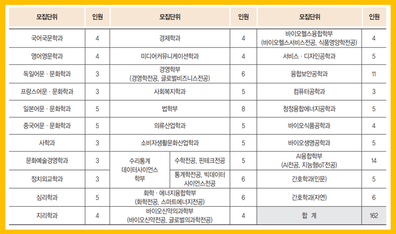 성신여대 수시 총 모집인원 1,364명 중 논술전형 모집인원은 162명(11.9%)입니다.