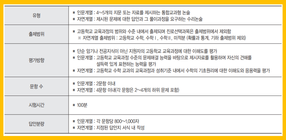 인문계열은 4~5개의 지문 또는 자료를 제시하는 통합교과형이며, 자연계열은 제시된 문제에 대한 답안과 그 풀이과정을 요구하는 수리논술입니다.