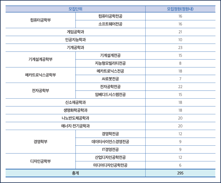 | 게임공학과, 인공지능학과, 기계공학과, 전자공학전공, 임베디드시스템전공, 신소재공학과, 나노반도체공학과, 산업디자인공학전공, 미디어디자인공학전공 |