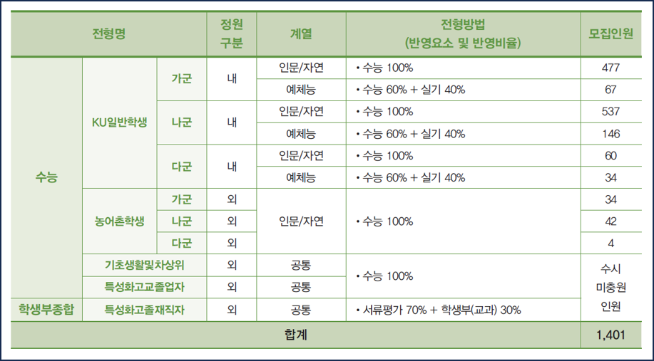 건국대는 2024학년도 정시전형에서 1,401명을 모집합니다. 오늘 블로그에서는 건국대 정시에 대해 모집인원 전형방법 수능반영방법 등에 대해 알아 보도록 하겠습니다.