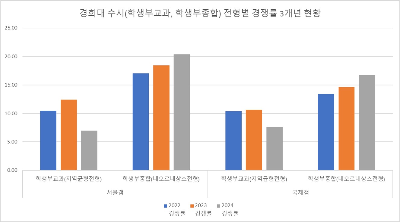 · 경희대는 학생부종합(네오르네상스전형)은 경쟁률이 꾸준히 증가하고 있으며, 학생부교과(지역균형전형)는 2024학년도에 경쟁률이 떨어지는 경향을 보였습니다.
