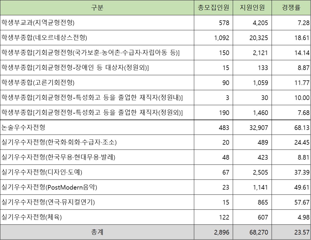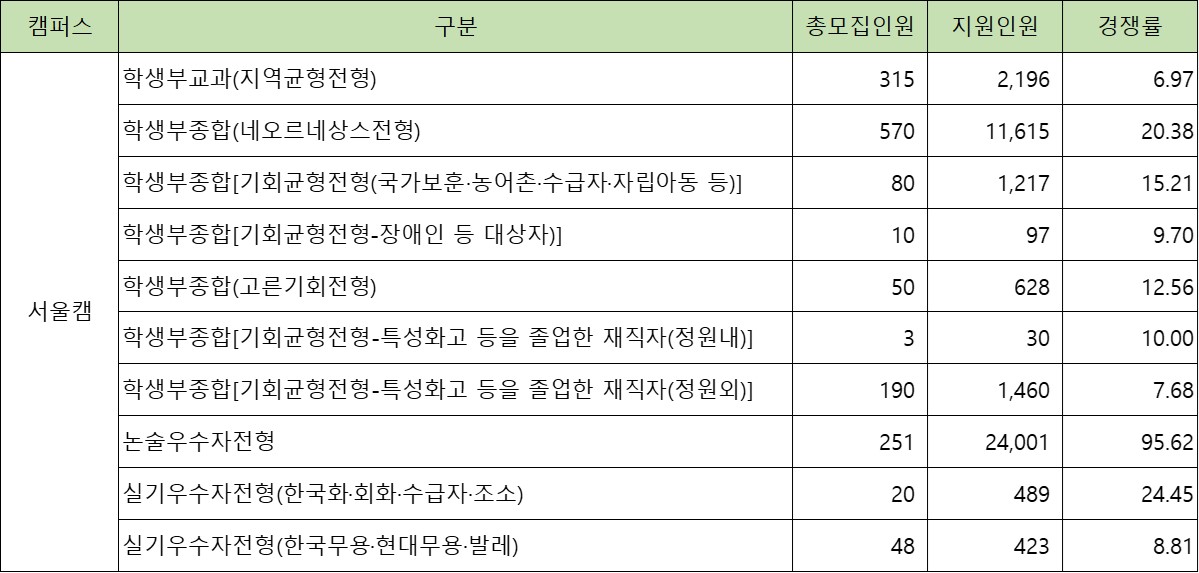· 학생부종합(네오르네상스전형)의 경쟁률은 18.61:1이었으며, 논술우수자전형은 68.13:1로 예상대로 가장 높은 경쟁률을 보였습니다.