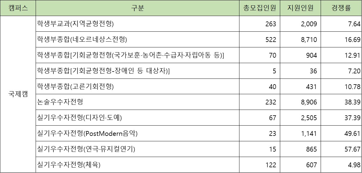 · 국제캠퍼스의 경쟁률은 학생부교과(지역균형전형)는 서울캠 대비 다소 높았으며, 학생부종합(네오르네상스전형)과 논술우수자 전형은 서울캠 대비 낮았습니다.