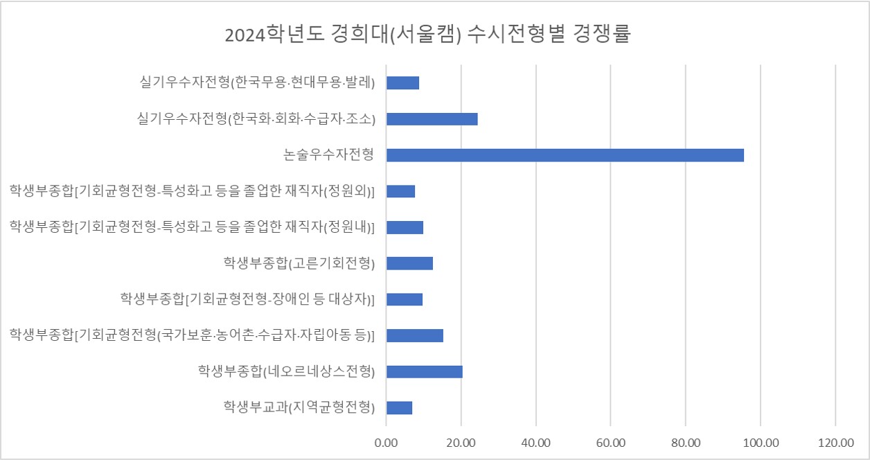 2024학년도 경희대 수시모집에서 서울캠퍼스는 27.43:1의 경쟁률을, 국제캠퍼스는 19.22:1을 나타냈습니다. 오늘 블로그에서는 전형별 경쟁률과 최근 3년 경쟁률에 대해 알아보겠습니다.