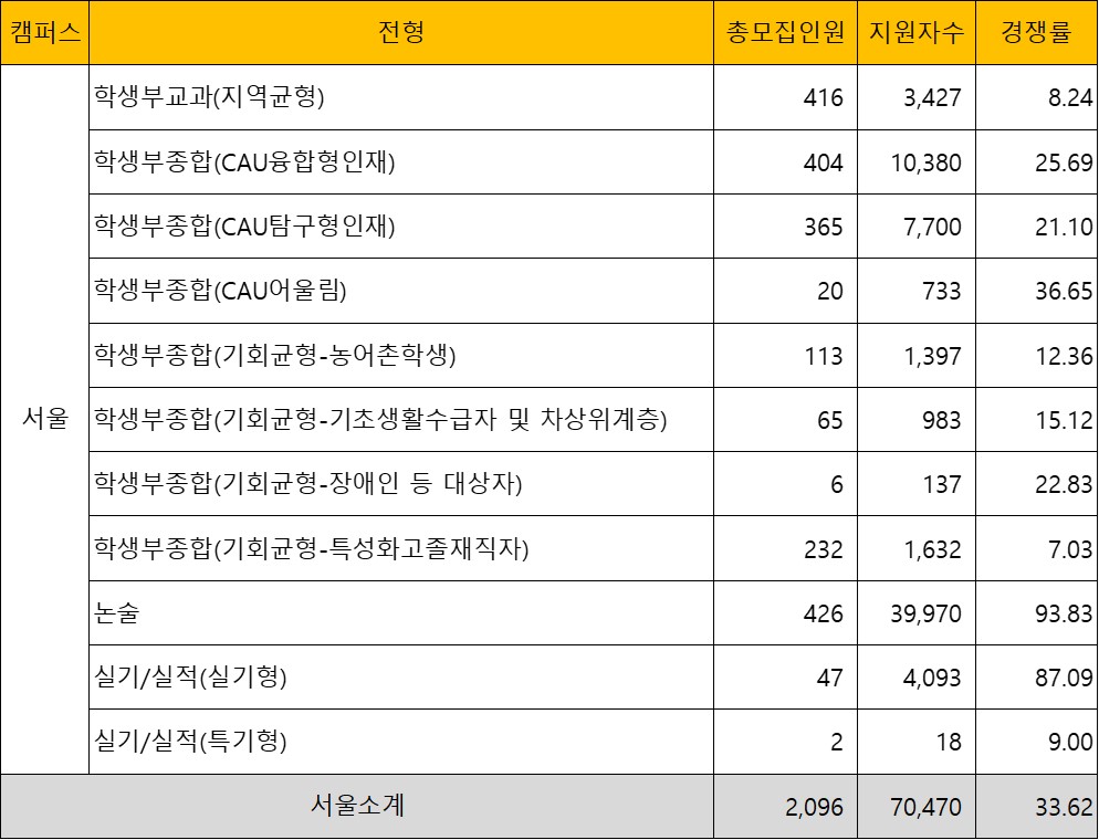 · 서울캠퍼스는 총 2,096명 모집에 70,470명이 지원하여 33.62:1의 경쟁률을 보였습니다.