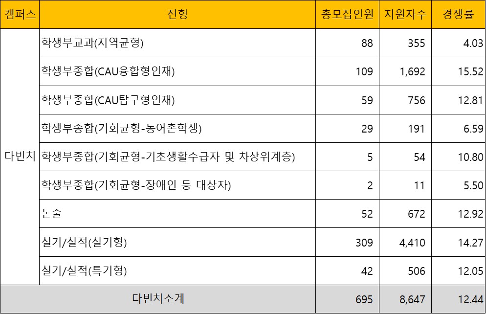 · 다빈치캠퍼스의 경우 학생부종합(CAU융합형인재) 전형이 15.52:1로 가장 높은 경쟁률을 보였으며, 학생부교과(지역균형) 전형이 88명 모집에 355명 지원으로 4:03:1의 가장 낮은 경쟁률을 나타냈습니다. 아래표를 참고 하십시요.
