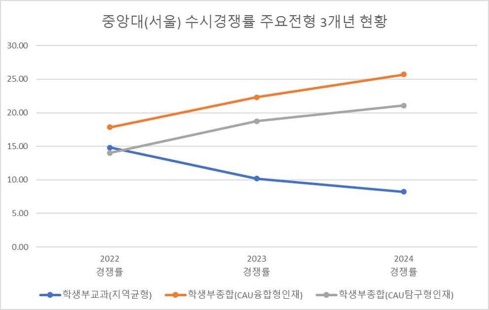 오늘은 2024학년도 중앙대 수시경쟁률 및 주요전형별 경쟁률 3개년 추이도 알아보겠습니다.