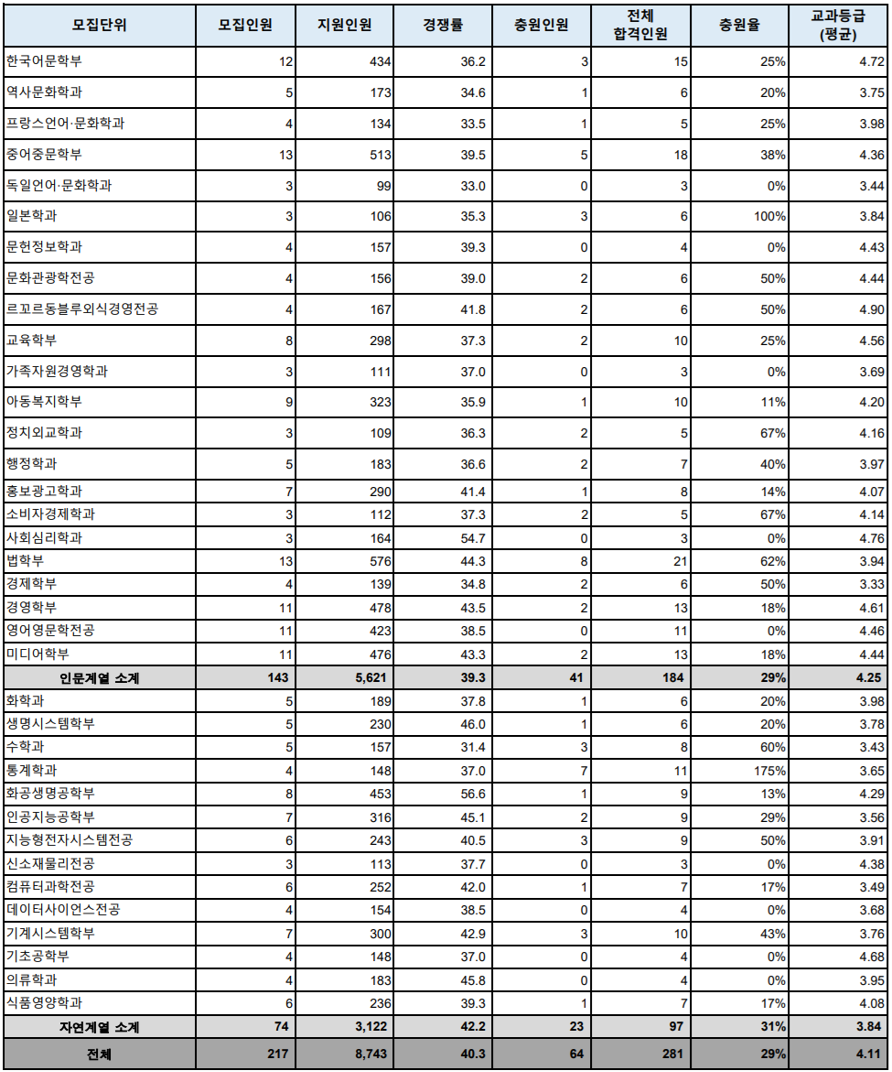 · 합격자 평균등급 : (인문) 4.25등급, (자연) 3.84등급