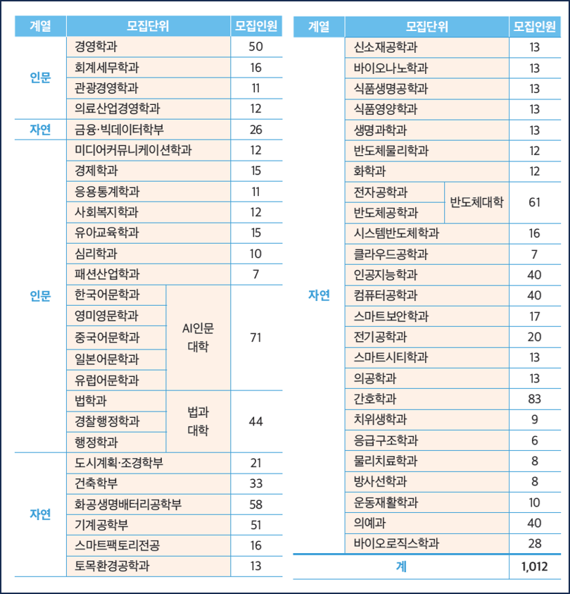 | 인문계열, 컴퓨터공학과, 간호학과 클라우드공학과, 바이오로직스학과 |