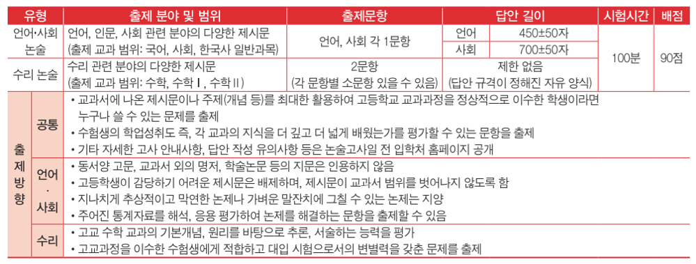 · 수리 논술 : 2문항 (각 문항별 소문항 있을 수 있음)