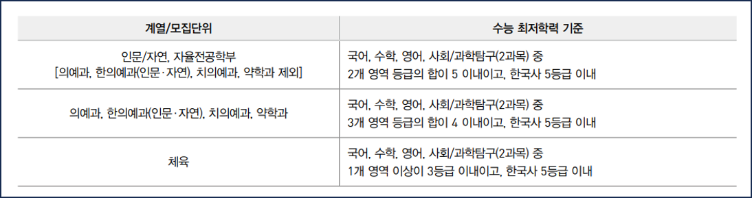 | 2026 경희대 서울캠퍼스 수시 수능최저 알아보기 (0) | 2025.02.07 |