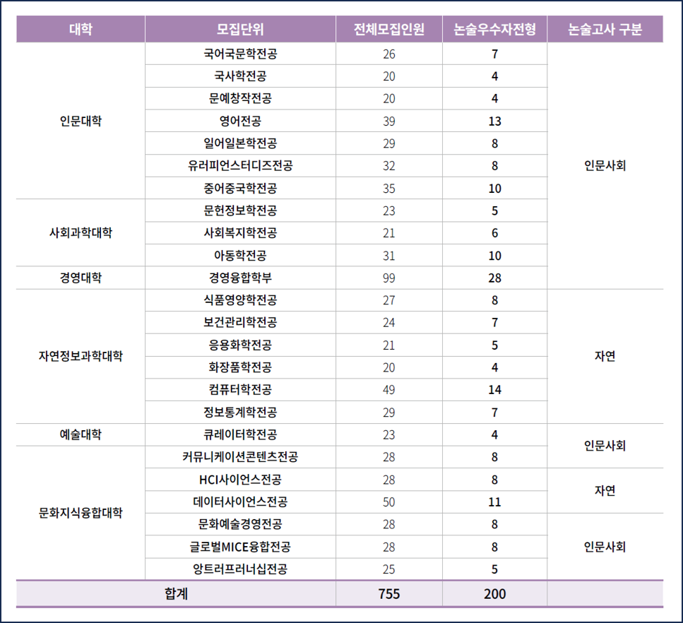 2025학년도 동덕여대 논술전형 모집단위 및 모집인원