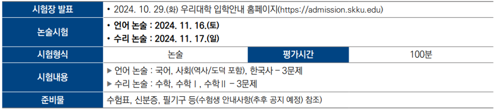· 논술시험 일정 : 2024. 11. 16 (토) ~ 11. 17 (일)