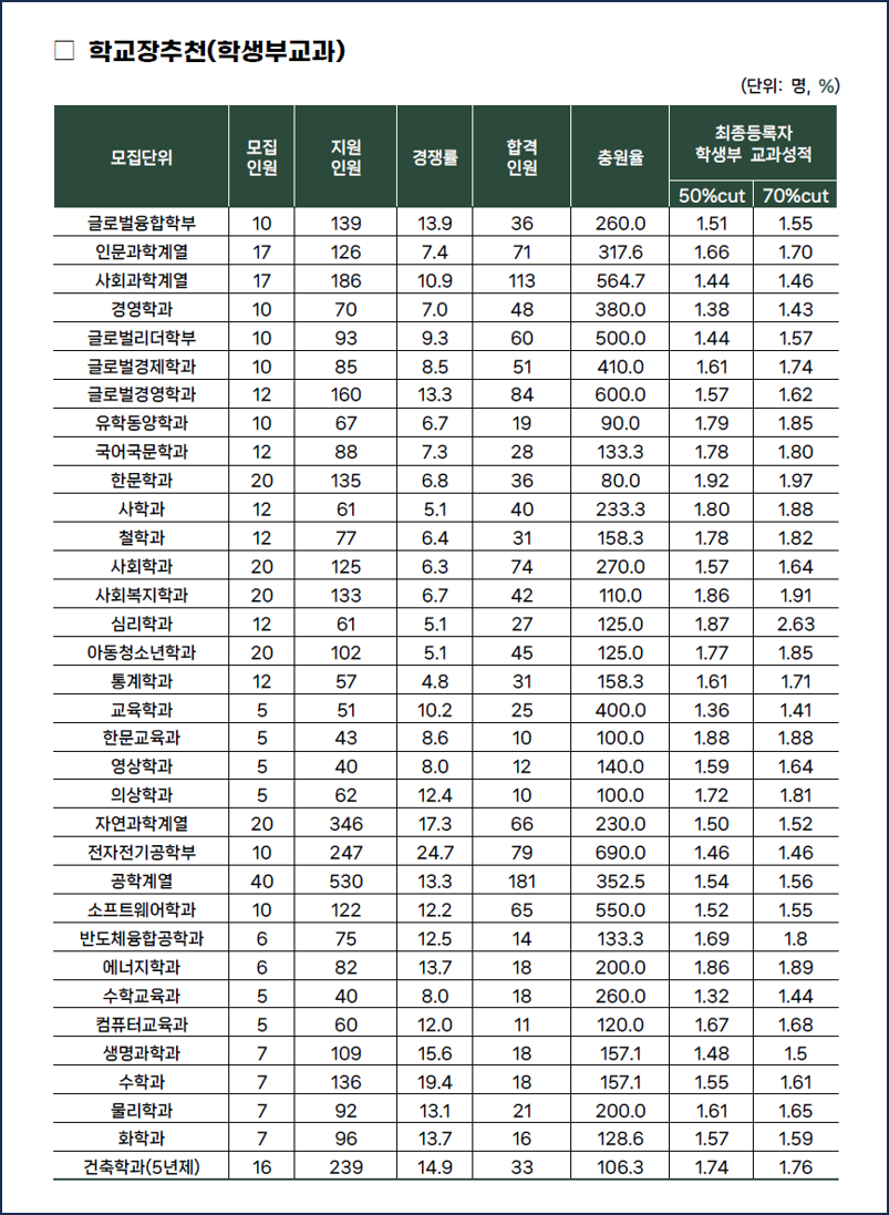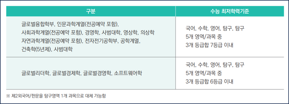 · 지원 불가 고등학교 : 특성화고(직업계열), 마이스터고, 예술고, 체육고, 방송통신고, 학력인정고, 일반/종합고의 전문계발, 해외소재 고등학교, 그 외 학생부 성적체계가 다른 고교