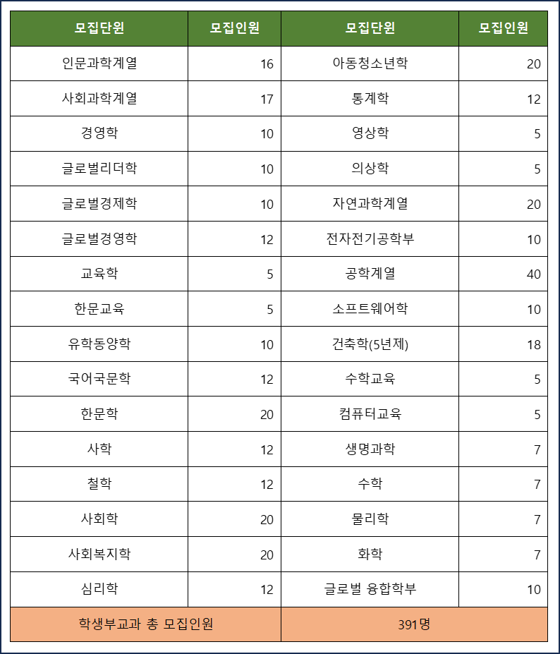 2025학년도 성균관대는 수시 학생부교과 전형으로 총 391명을 선발합니다. 이는 수시모집 전체(정원내) 1,900명 중 20.6%에 해당됩니다. 이번 블로그에서는 성균관대 학생부교과 전형에 대해 자세히 알아 보겠습니다.