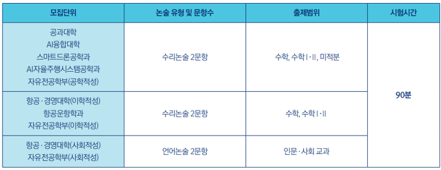 2025학년도 한국항공대 논술전형 논술유형 및 출제범위 (출처 : 한국항공대 입학처)