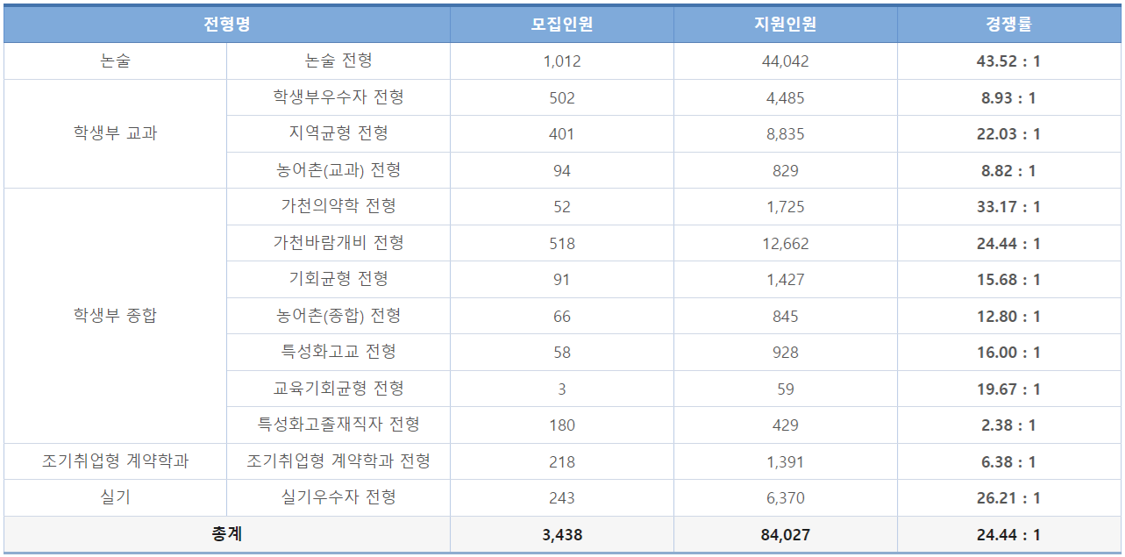 가천대는 2025학년도 수시모집에서 3,438명 모집에 84,027명 지원하여 24.44:1의 경쟁률을 나타냈습니다. 이번 블로그에서는 2025 가천대 수시 전형별 경쟁률에 대해 알아 보겠습니다.
