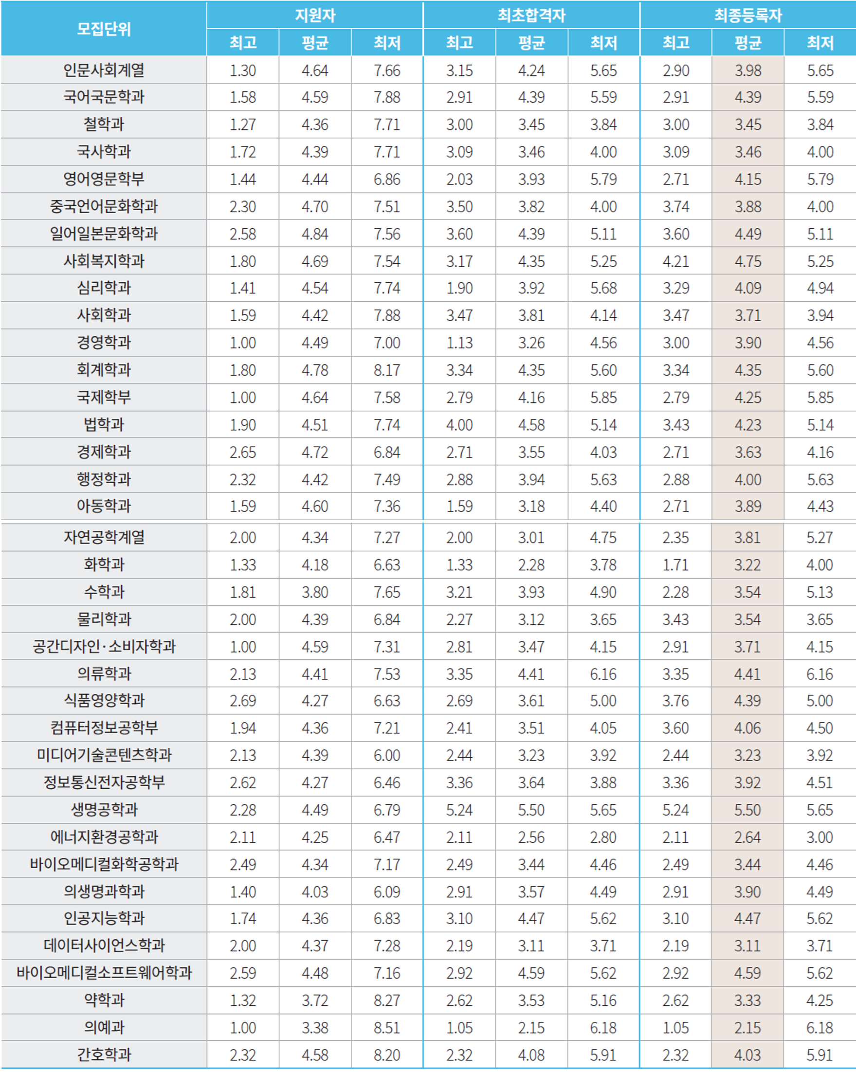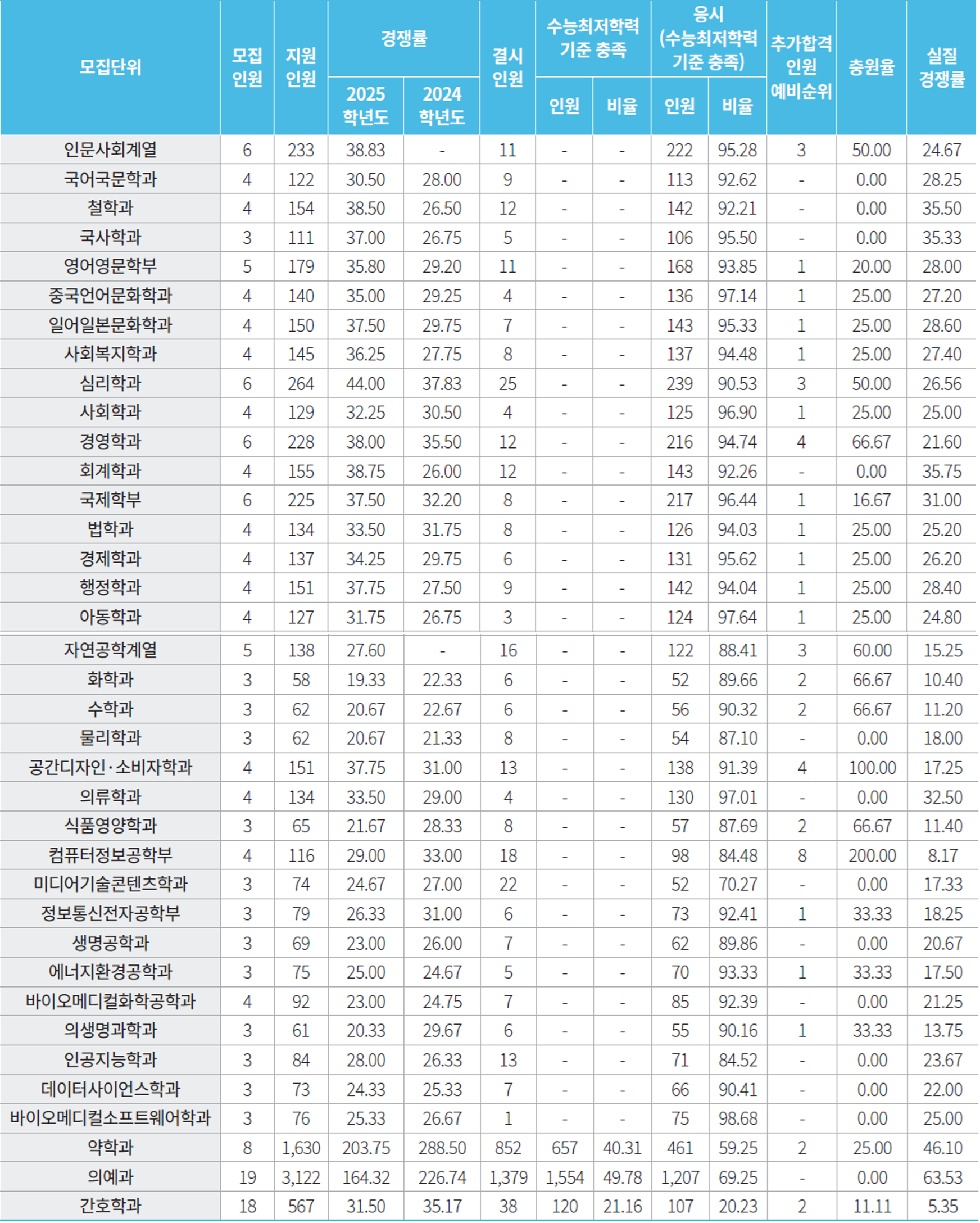 - 약학과, 의예과, 간호학과 : 국어/영어/수학/사회/과학/한국사 반영교과 평균등급