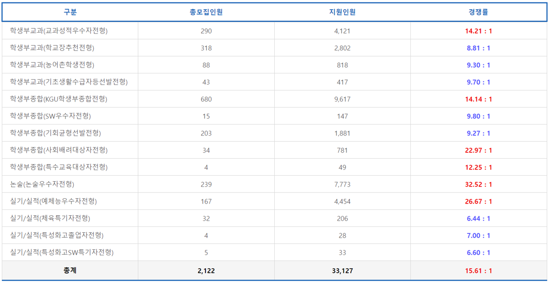 경기대는 2025학년도 수시모집에서 총 모집인원 2,122명에 지원인원 33,127명으로 15.61:1의 경쟁률을 보였습니다. 이번 블로그에서는 2025 경기대 수시 전형별 경쟁률에 대해 알아보겠습니다.