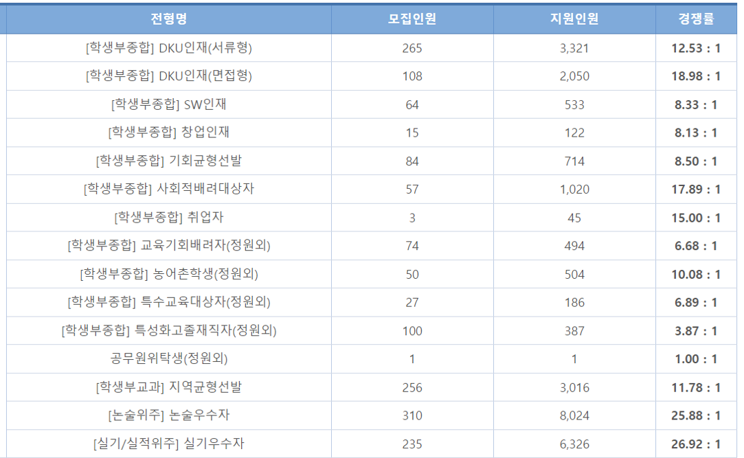 | 모집단위 | DKU인재 서류형 | DKU인재 면접형 | 지역균형선발 | 논술 |