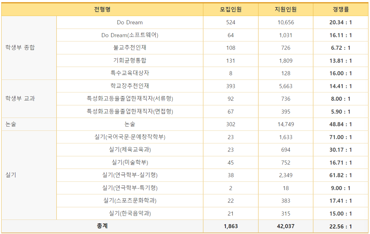 동국대는 2025학년도 수시모집에서 총 모집인원 1,863명에 지원인원 42,037명으로 22.56:1을 나타냈습니다. 이번 블로그에서는 2025 동국대 수시경쟁률에 대해 알아 보겠습니다.