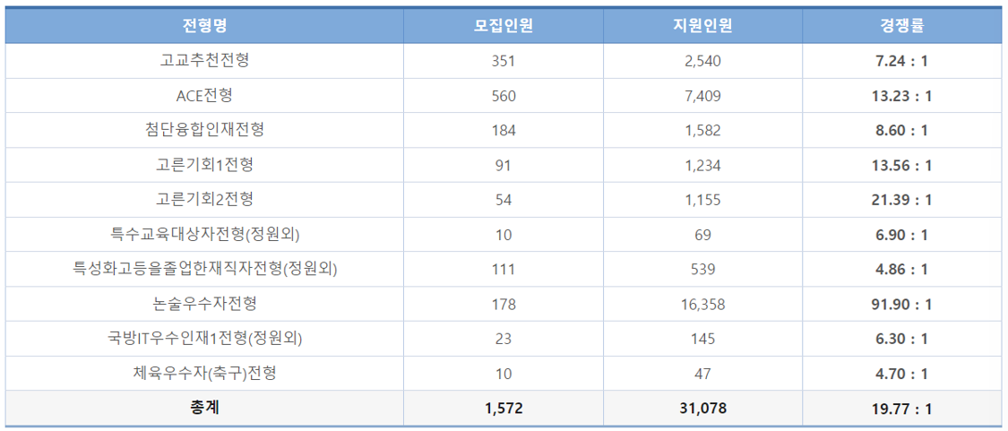 | 모집단위 | 고교추천전형 | ACE전형 | 첨단융합인재전형 | 논술 |