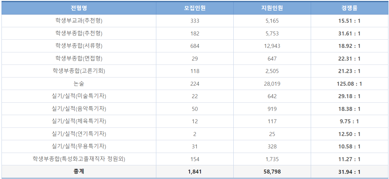 · 학생부교과 15:1, 학생부종합 20:1~30:1, 논술 125:1로 집계