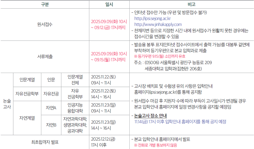 2026학년도 세종대 수시 논술전형에 지원하고자 하는 수험생들은 입학처 홈페이지에서 세부사항을 반드시 확인하시기 바랍니다.